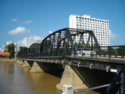 場所は市内の東側、ピン河にかかるメインの橋ナラワット橋の一つ下流の鉄橋を渡った所で直ぐに解ります。